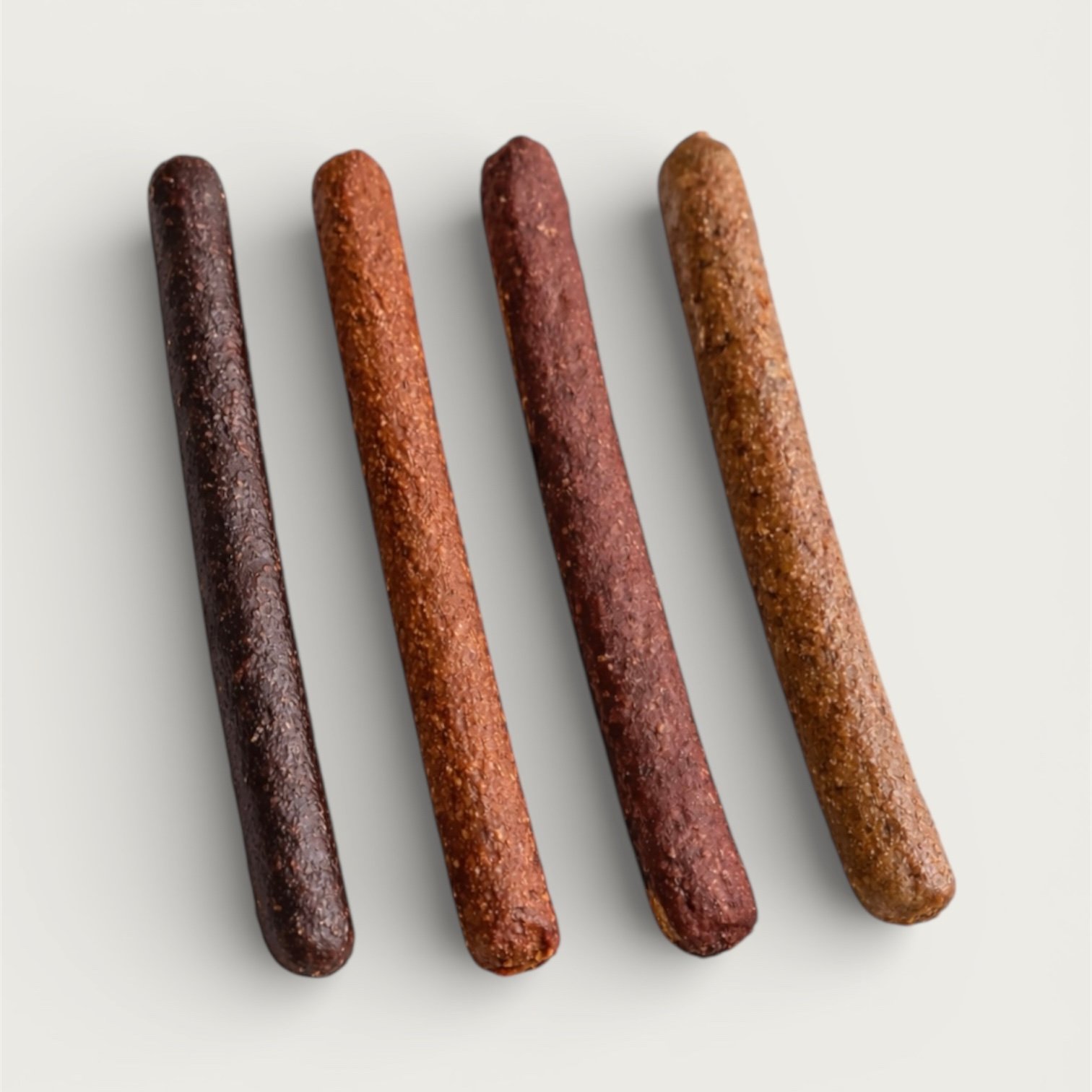 Our 100% meat sticks are available in Salmon, Duck, Venison, and Partridge – ideal for dogs with sensitive stomachs.